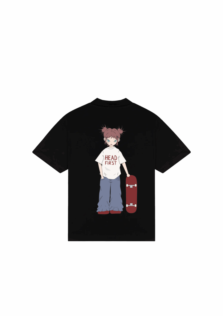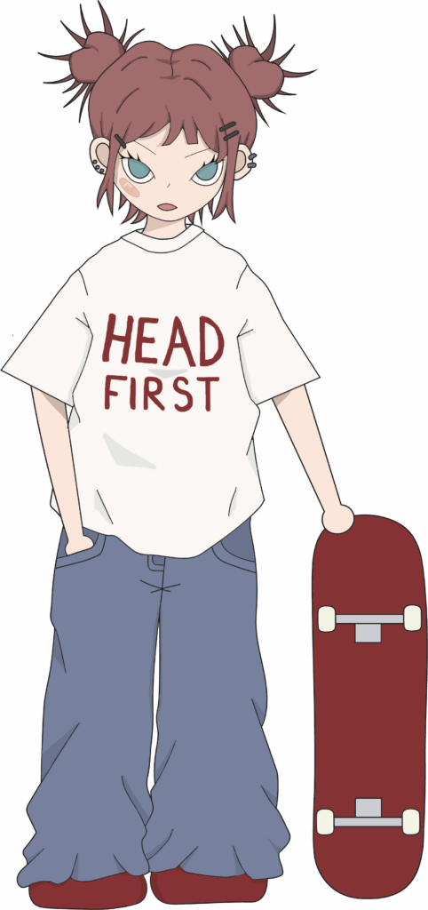 grafische tools Skateboard merk huisstijl June 4, 2025 / No Comments Voor deze opdracht moesten we een huisstijl maken voor het skateboard merk Head First. Ik heb gekozen om het logo een karakter te maken. En ik heb deze op skateboards en kleding gezet.