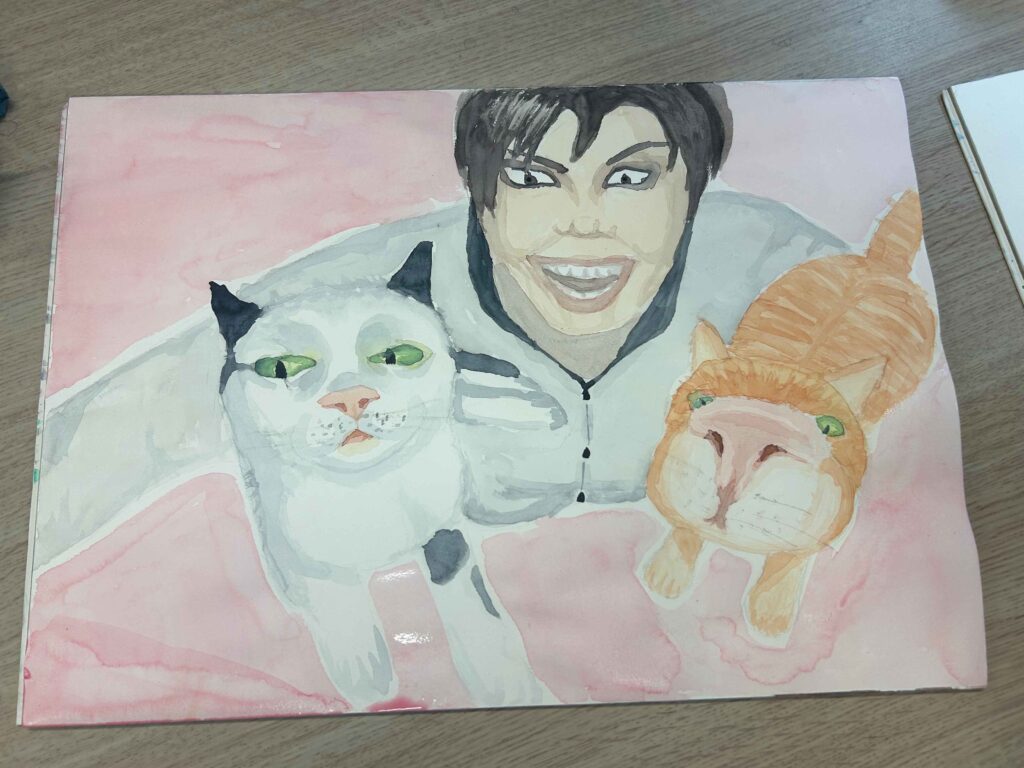 tekenen Aquarel June 11, 2025 / No Comments Voor deze opdracht moesten we met aquarel verven. Ik heb gekozen om mijn katten Pip en Ruby te maken. En op de achtergrond zie je Kris Jenner.