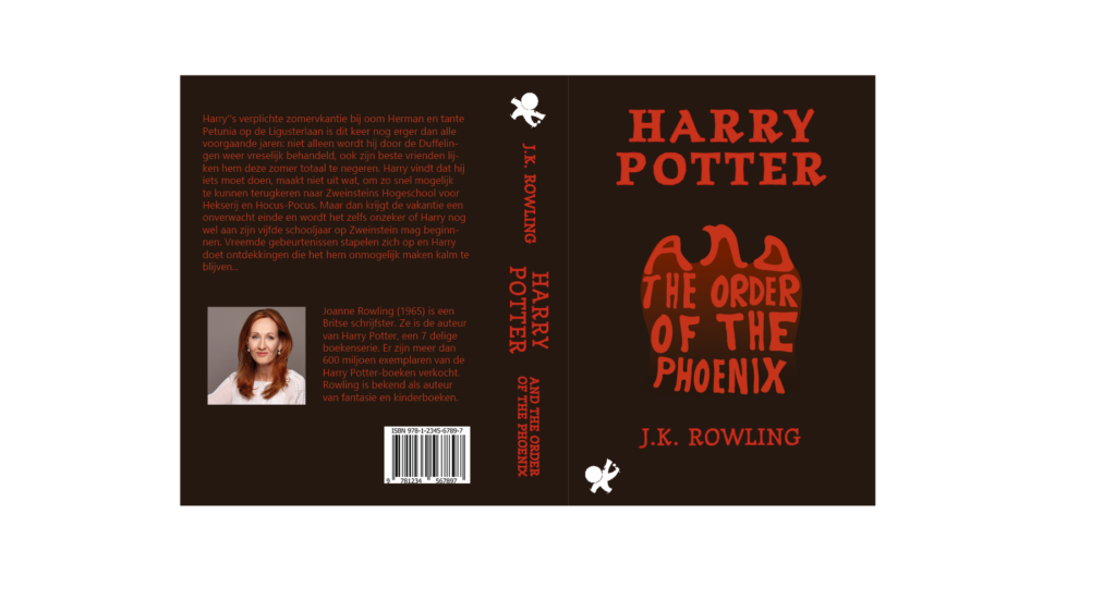 Voor deze opdracht moesten we een boek cover ontwerpen voor een boek naar keuze. Ik heb voor het boek “Harry Potter And The Order Of The Phoenix” gekozen. Ik heb eerst een schets van de voorpagina gemaakt. Daarna heb ik die schets uitgewerkt in Illustrator. De phoenix en de en de letters in de phoenix heb ik gemaakt met de pen tool. Op de achterkant van staat de samenvatting van het boek en informatie over de schrijver.