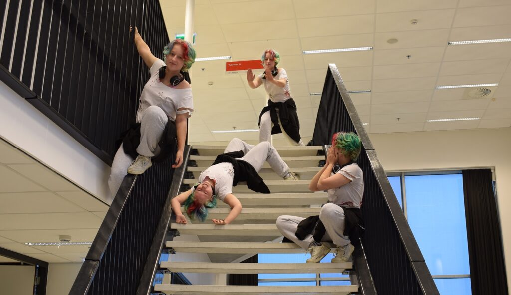 I decided to take pictures of me on the stairs in my school. I’ve always been climbing on anything and everything, so it was perfect in my eyes. The story is that I pushed myself off the stairs, and that I am shocked to see myself fall. I am a comedic genius /j.