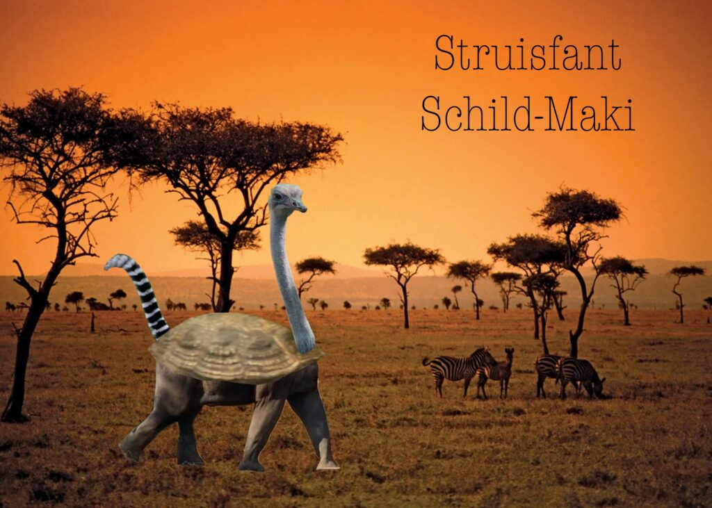 Please meet my Struisfant Schild-maki. The name is in dutch. If you translate it, you would get: OctrichElephant Shield-Lemur (turtles are shield-toads if you translate it literally). It lives on the African Savanna and likes to eat berries.