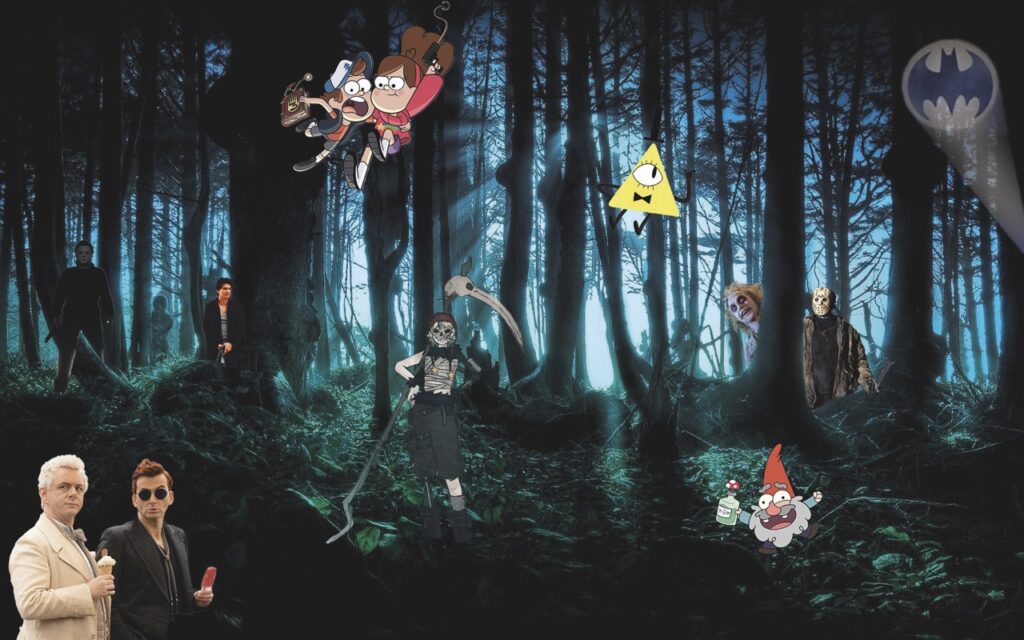 The assignment was to find a random picture on google and then to add a bunch of figures/characters/whatever you felt like. So I picked a ‘spooky’ forest as a background and added a bunch of characters I thought would look fun in the forest. This would be a crazy crossover though, would it not? Of course I couldn’t keep our lord and saviour Bill Cipher away. The character in the center is an original character that one of my friends drew. Credit to Pokémoth for drawing Sam, the character with the big scythe.