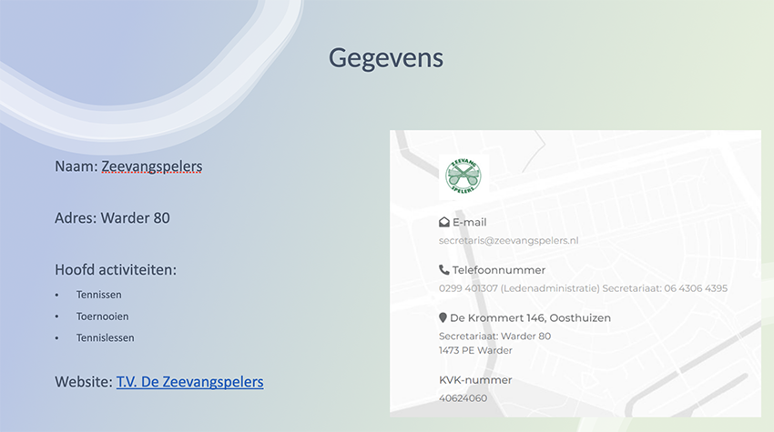 Als onderdeel van de huisstijl heb ik ook een ledenpas ontworpen voor de tennisvereniging Zeevangspelers. Op de voorkant staan de belangrijkste gegevens van het lid, zoals naam, geboortedatum, verenigingsnummer en bondsnummer. Het ontwerp sluit volledig aan bij de huisstijl en zorgt voor een professionele en herkenbare uitstraling.