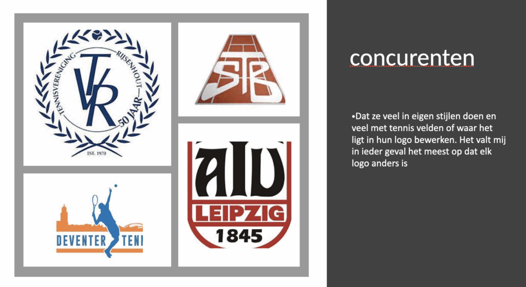 In mijn ontwerp heb ik gewerkt met duidelijke lijnen en vormen die kracht en beweging uitstralen, passend bij tennis als sport. De kleuren sluiten aan bij de sportieve uitstraling van de vereniging en zorgen ervoor dat het logo ook in gebruik, bijvoorbeeld op kleding of drukwerk, goed zichtbaar blijft. Daarnaast heb ik verschillende typografieën onderzocht om tot een lettertype te komen dat zowel strak als goed leesbaar is.