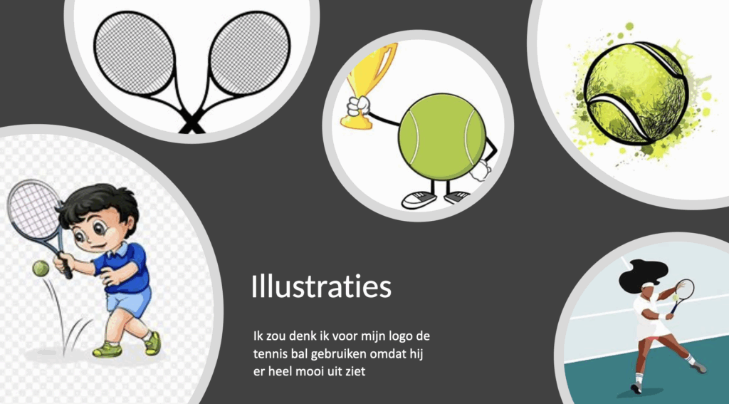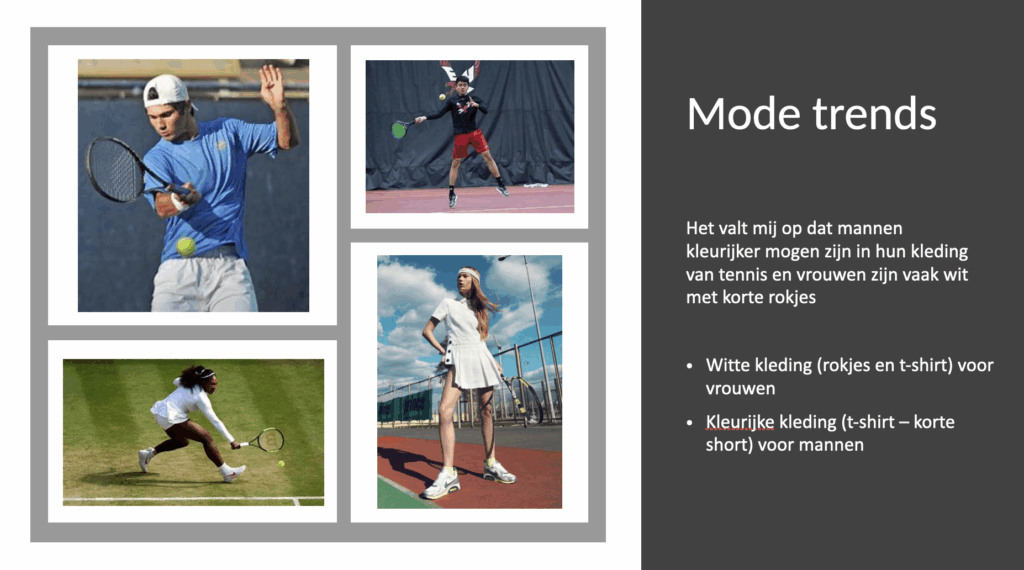 Ik liet mij inspireren door typische tenniskleuren en door materialen die met tennis te maken hebben, zoals rackets en ballen. Uiteindelijk ben ik daar in mijn verdere ontwerp niet mee verdergegaan, maar dit moodboard laat goed zien hoe mijn denkproces is gestart en welke eerste richtingen ik heb onderzocht.