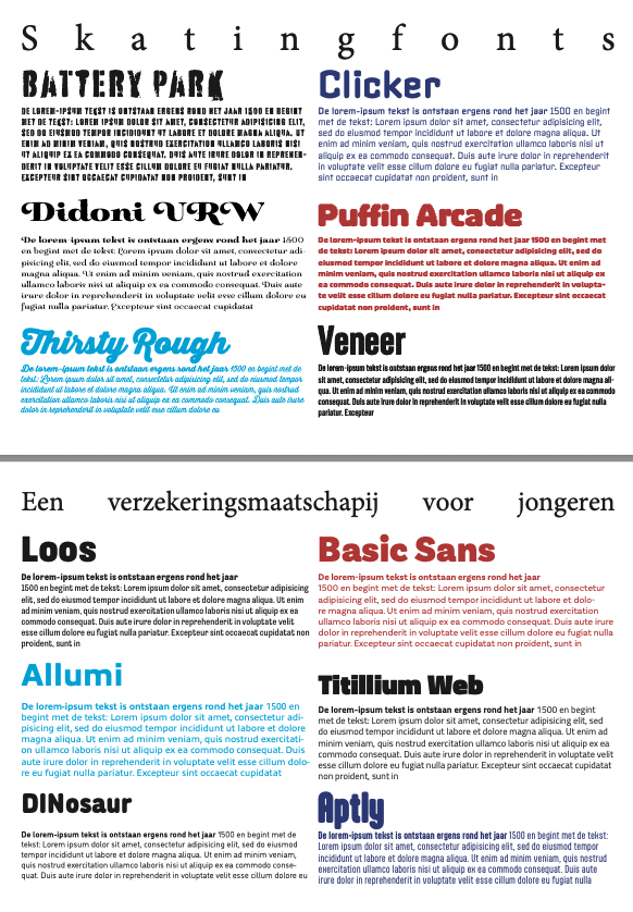 Daarna ging ik weer terug naar het werken met lettertypes. Ik kreeg de opdracht om geschikte lettertypes te zoeken voor verschillende bedrijven en producten, waaronder energiedranken, verzekeringsbedrijven, skatingfonts en een zakenbank. Voor elk van deze categorieën moest ik zes lettertypes vinden.