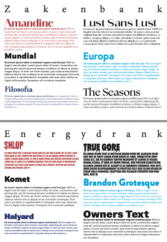 Als je nieuwsgierig bent naar hoe dit proces precies verloopt, kun je het uiteraard zelf proberen. Voor wie liever kijkt, heb ik hieronder mijn resultaat geplaatst. De gekleurde lettertypes zijn mijn persoonlijke keuzes, de lettertypes die ik zou gebruiken voor de betreffende soorten bedrijven.