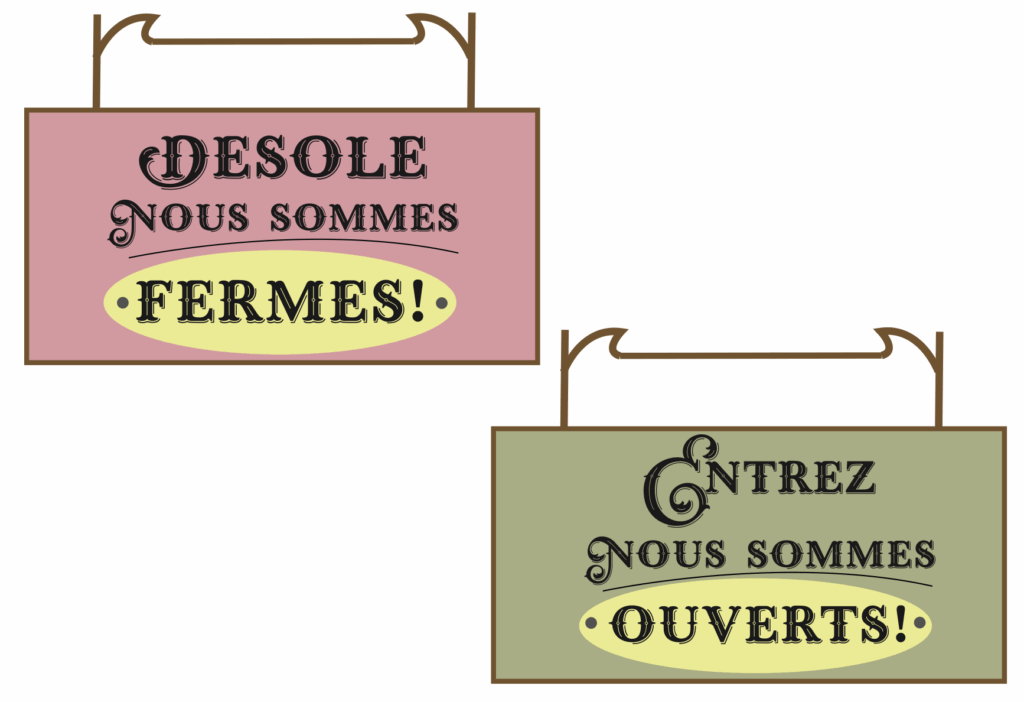 Na het onderzoek naar lettertypes kreeg ik de opdracht om open- en geslotenborden te ontwerpen. Ik moest dit doen voor zowel een Frans bedrijf als een Amerikaans bedrijf. Hierdoor werd duidelijk zichtbaar wat de verschillen zijn in stijl en presentatie tussen de twee culturen.