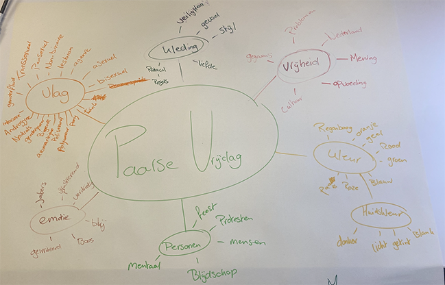 Voor mijn bordspel heb ik maar liefst 84 vragenkaartjes ontworpen, elk met unieke vragen over Paarse Vrijdag. De kaartjes variëren in moeilijkheid, waarbij rood–groen staat voor de makkelijkere vragen en groen–paars voor de moeilijkere. Dit maakte het een uitdagend proces, omdat ik veel onderzoek moest doen om goede en gevarieerde vragen te bedenken.