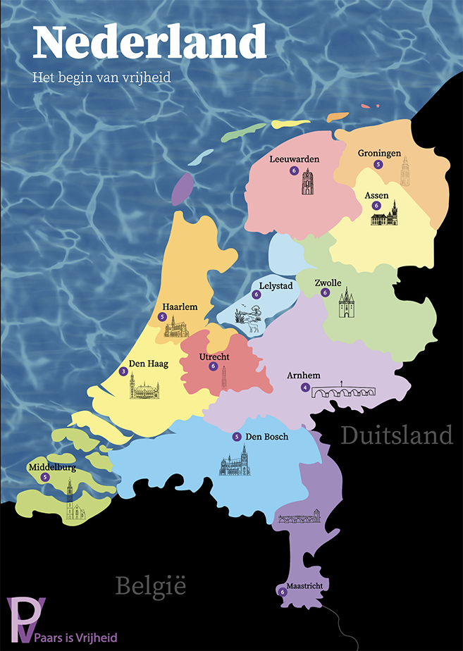 Om te zorgen dat de omliggende landen niet te veel afleiden, heb ik deze zwart gemaakt, met een donkergrijze belettering zodat de landsgrenzen nog zichtbaar zijn. Links onderin staat één van mijn nieuwe logo’s, die ik speciaal voor dit project heb ontworpen. Het idee hiervoor kwam spontaan toen ik ’s nachts wakker werd en dacht: “Paars is vrijheid”. De volgende dag ben ik meteen begonnen om dit concept uit te werken.