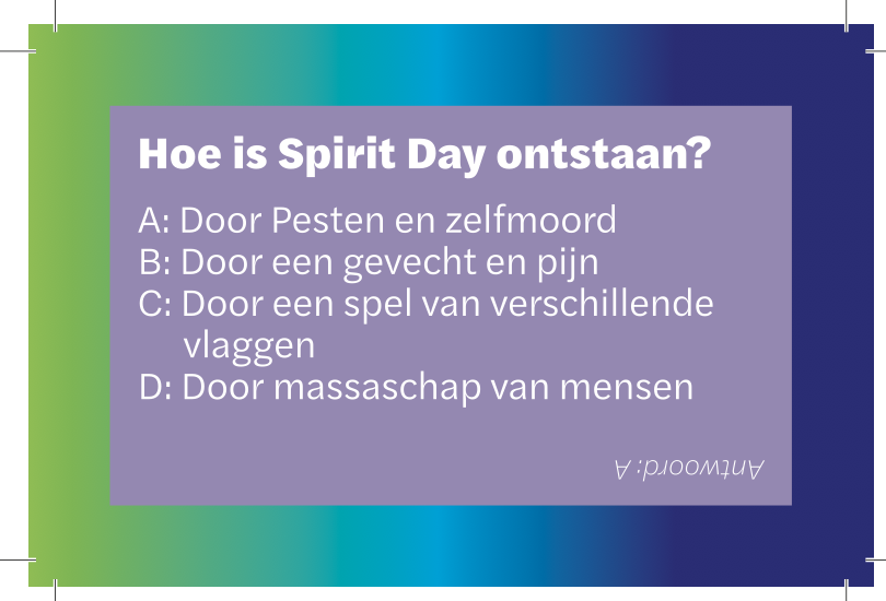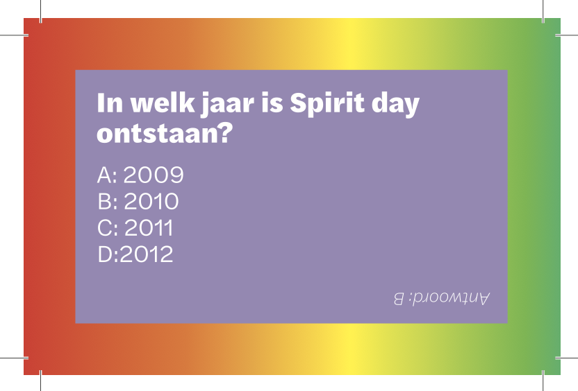 Onderstaand zie je één voorbeeld van een makkelijk kaartje, één voorbeeld van een moeilijk kaartje en één achterkant van een kaartje. Dit geeft een goed beeld van de stijl en opzet, zonder dat je alle 84 kaartjes hoeft door te lezen.