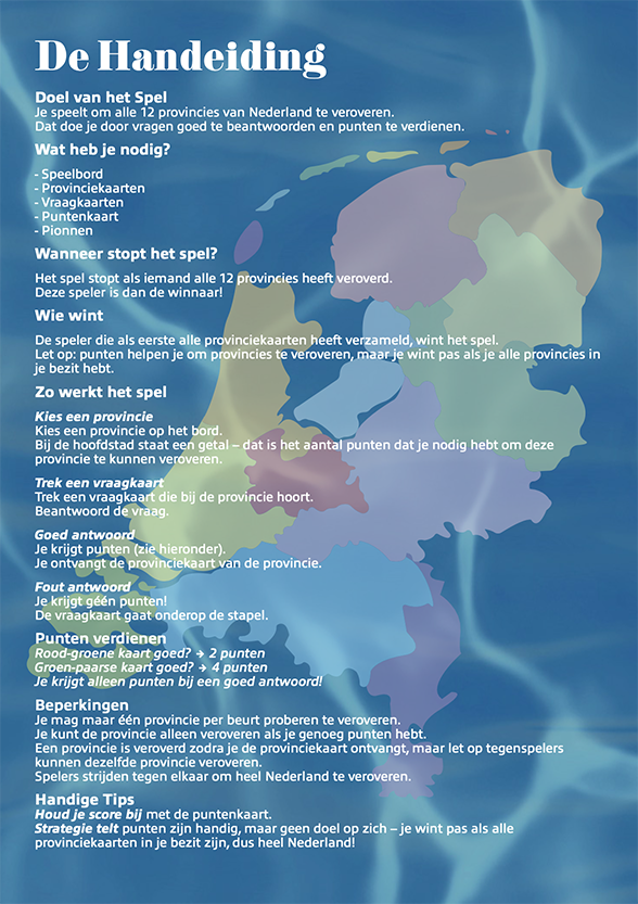 Uiteraard hoort er bij een bordspel ook een duidelijke uitleg. Tijdens het maken van het bord en de kaartjes was ik al bezig met bedenken hoe het spel gespeeld zou moeten worden. Omdat het onmogelijk is om dit aan iedereen persoonlijk uit te leggen als het spel daadwerkelijk uitgebracht wordt, heb ik besloten om een volledige handleiding uit te schrijven.