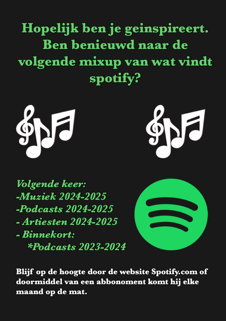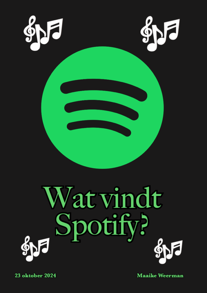 Het ontwerp heb ik volledig in InDesign gemaakt. Ik heb geprobeerd het geheel zo te maken dat het goed past bij het logo en de stijl van Spotify, met een moderne en overzichtelijke opmaak. Het resultaat vind ik erg geslaagd: het boekje ziet er mooi uit, heeft een duidelijke structuur en sluit goed aan bij het gekozen thema. Ik ben er erg tevreden mee.