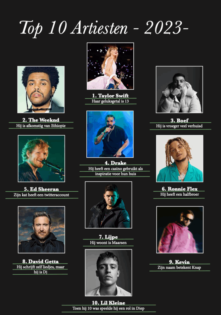 Voor deze opdracht moest ik een smoelenboekje maken over een zelfgekozen onderwerp. In het begin wist ik niet meteen waar ik mee wilde beginnen, maar omdat ik vaak muziek luister via Spotify, besloot ik om mijn top 10 nummers en artiesten als onderwerp te kiezen.