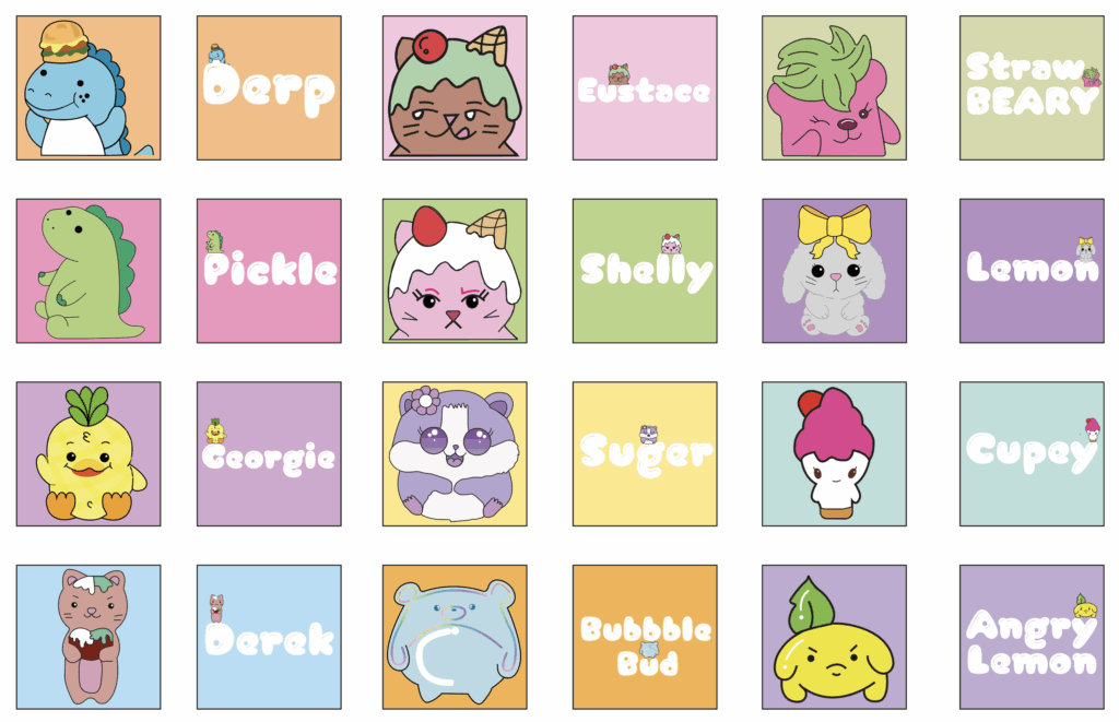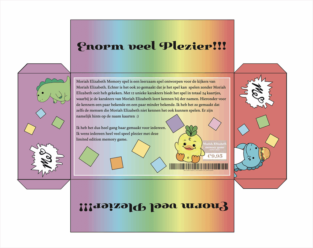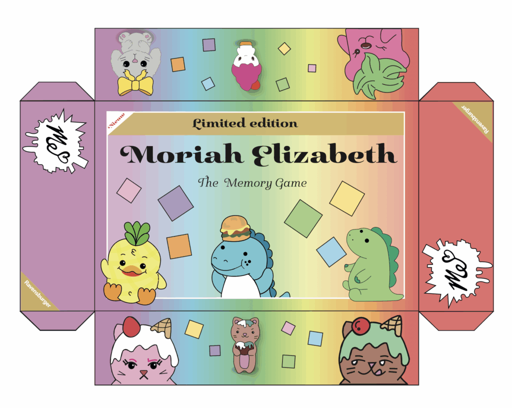 Voor deze opdracht heb ik een memory game ontworpen met 24 voorkanten en 24 achterkanten. Het thema van het spel is gebaseerd op de creatieve wereld van Moriah Elizabeth, omdat ik haar karakters erg leuk en inspirerend vind.