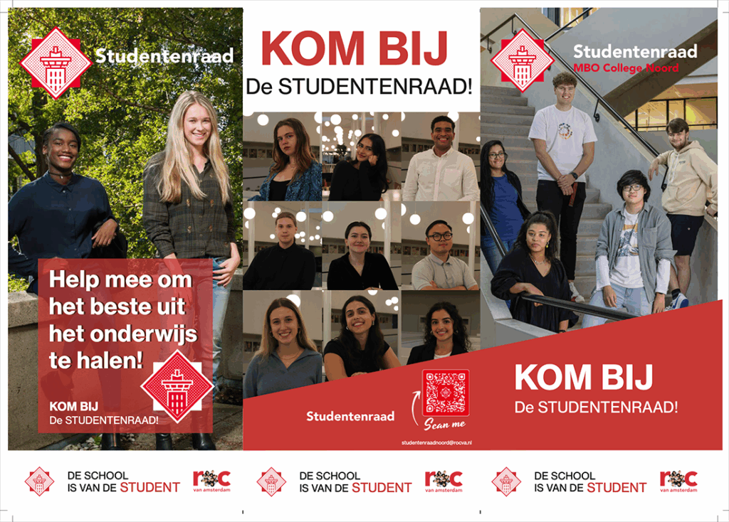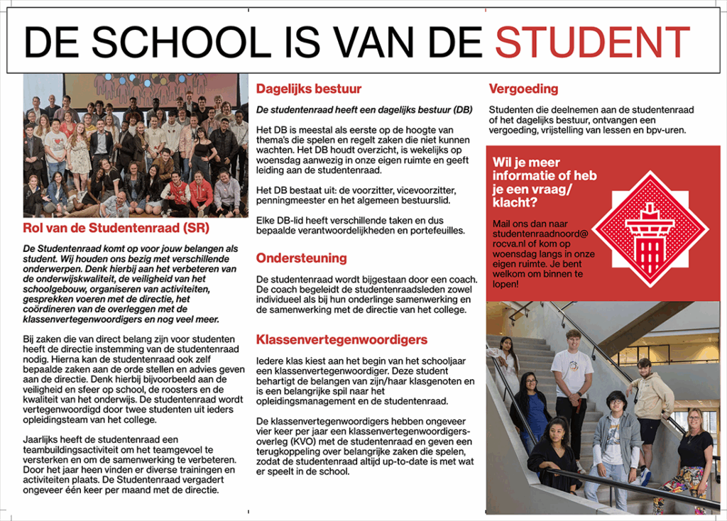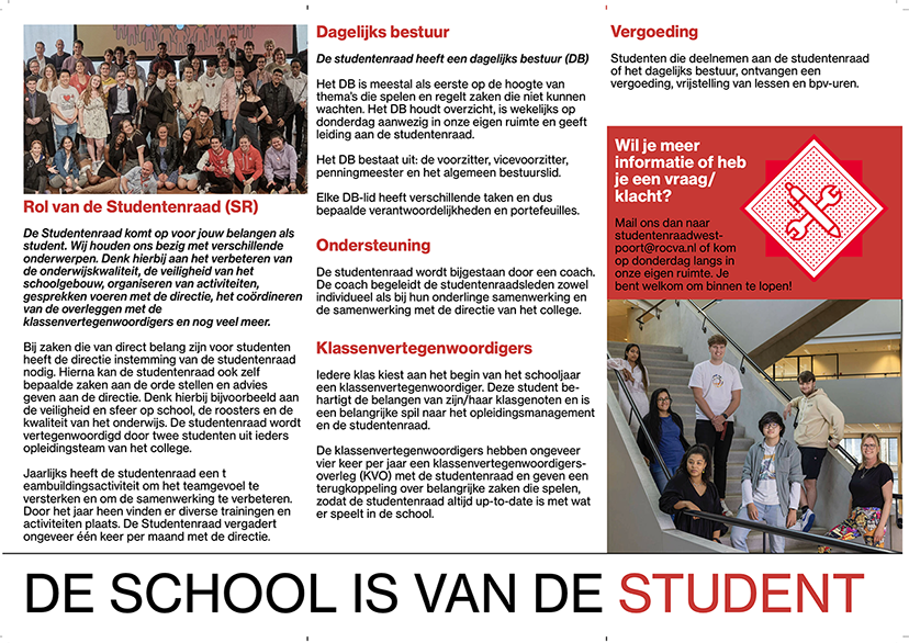 Omdat ik in de studentenraad zit, werd mij gevraagd om een drievlaks vouwfolder te ontwerpen. Ik kreeg hiervoor de teksten, afbeeldingen en logo’s aangeleverd; mijn taak was om er een aantrekkelijk en overzichtelijk design van te maken.