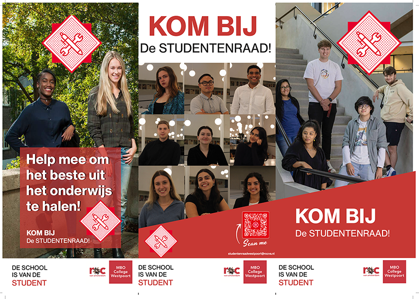De studentenraad was zo tevreden met mijn werk dat ik later ook werd gevraagd om een vouwfolder te maken voor het ROC College in West. Omdat daar geen eigen afbeeldingen werden aangeleverd, heb ik de foto’s uit de folder van Noord opnieuw gebruikt. Uiteraard is het ontwerp zelf volledig aangepast aan de huisstijl en inhoud van West, zodat het toch een eigen uitstraling kreeg.