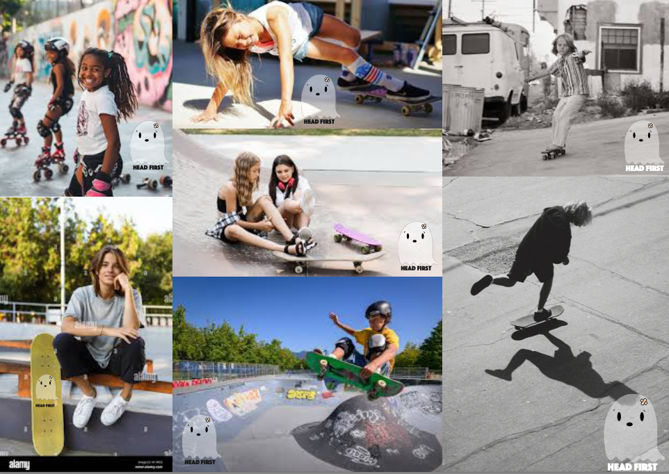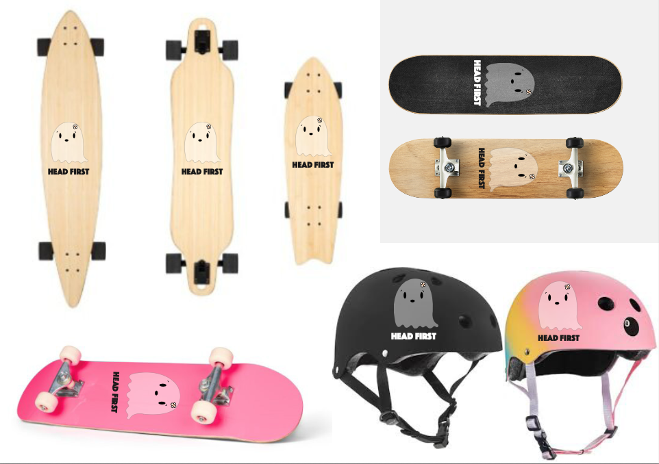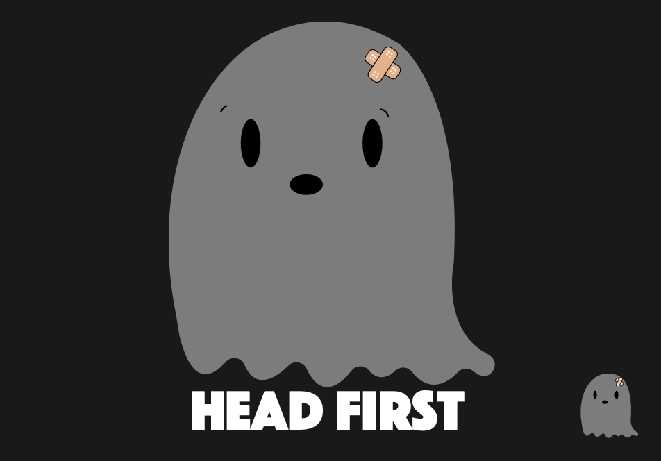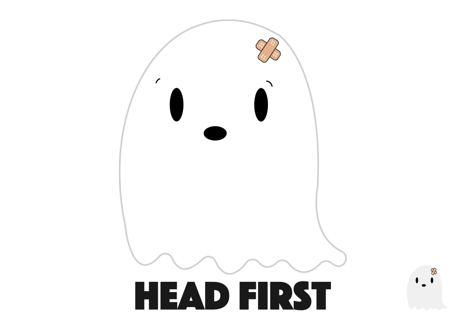 Toen kreeg ik het idee om een geestje te maken dat op zijn hoofd was gevallen, dus letterlijk head first. Om het ontwerp speels te maken, heb ik pleisters toegevoegd die eruitzien als skateboard-plankjes. Het resultaat is een schattig, creatief en uniek logo waar ik erg trots op ben.