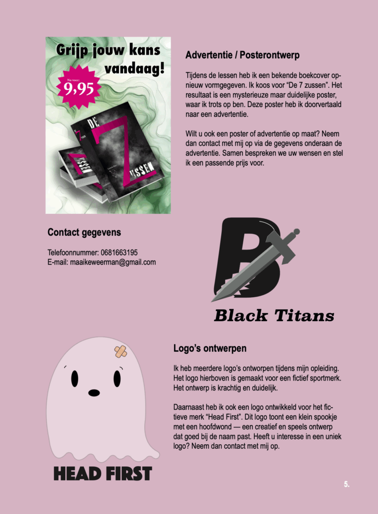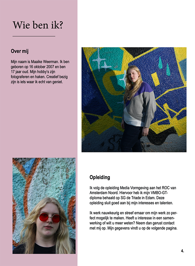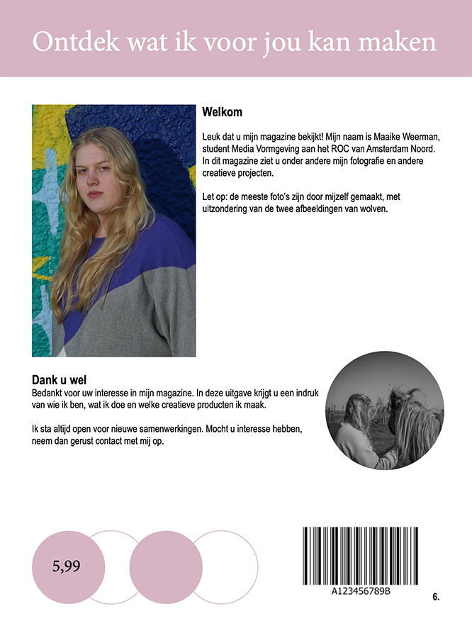 Voor deze opdracht heb ik een magazine gemaakt over mezelf en enkele van mijn werkstukken. Het proces begon met online onderzoek naar hoe een magazine is opgebouwd en welke stijlen mij aanspreken. Vervolgens heb ik het ontwerp volledig zelf gerealiseerd.