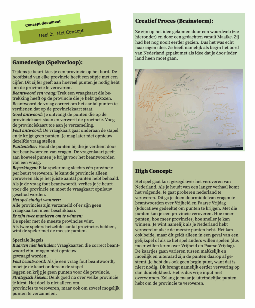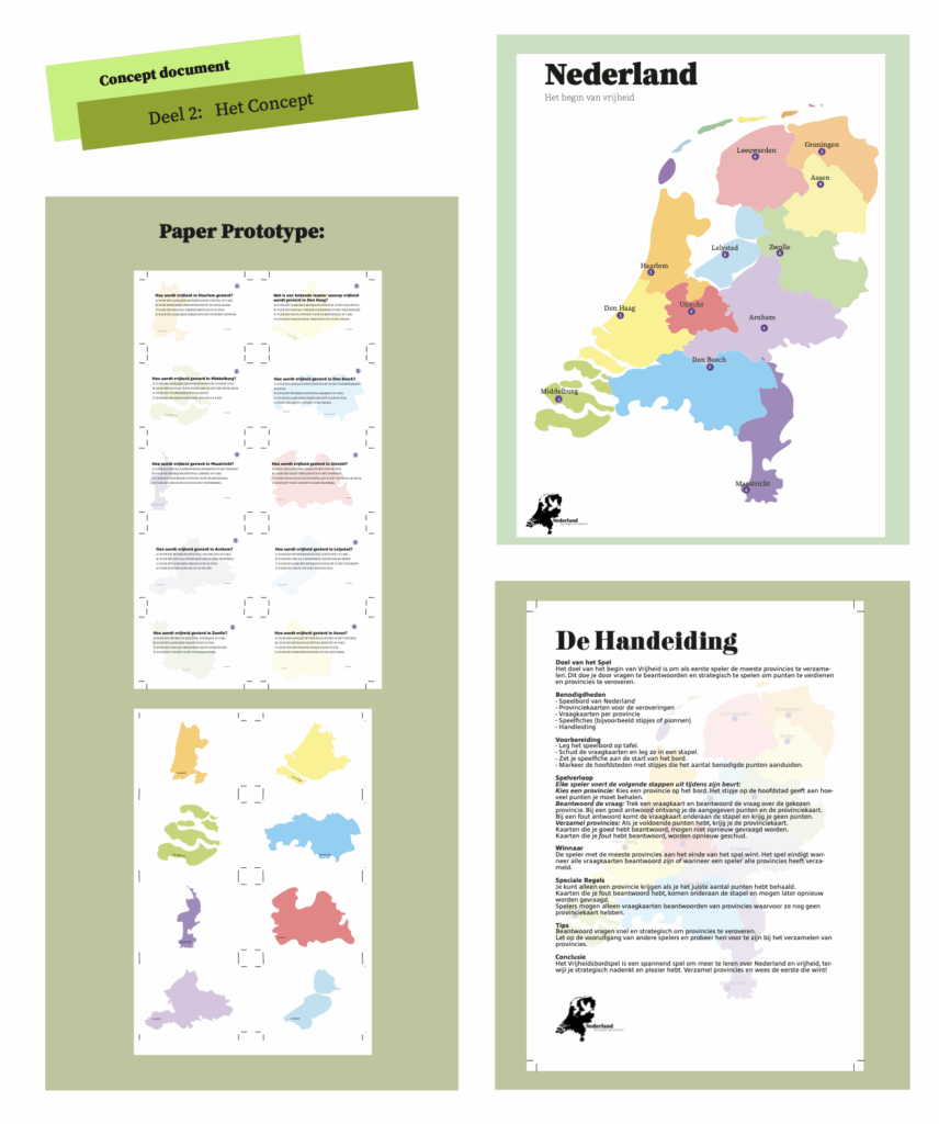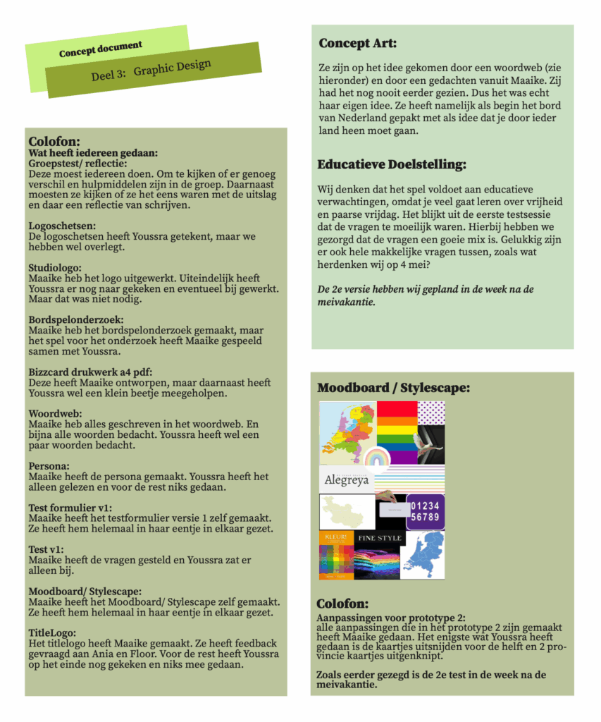 Voor dit project heb ik een compleet conceptbestand gemaakt waarin alles is verwerkt: brainstorms, moodboard, testdocumenten en mijn ideeën voor het bordspel. In mijn conceptbestand staat ook een foto van mij en mijn oude groepsgenoten, en bevat het nog het oude logo van het project. Omdat ik er zeker van wilde zijn dat er niets van het oude in mijn eindresultaat terecht zou komen, heb ik ervoor gekozen om het bord, de handleiding en de kaartideeën te schrappen. Ook al waren deze volledig mijn ideeën. Uiteindelijk heb ik een nieuw logo ontworpen om het project een frisse en eigen uitstraling te geven.