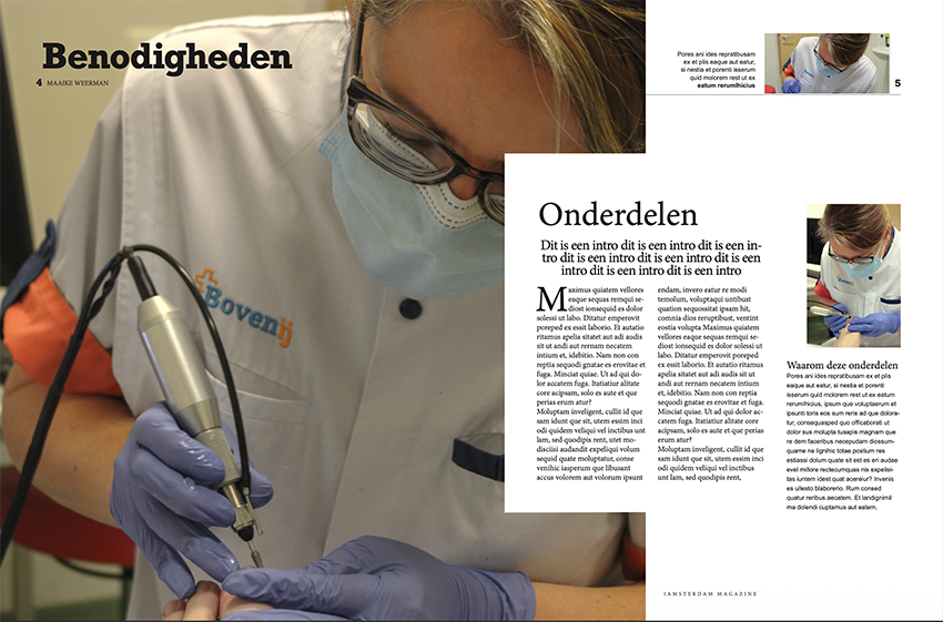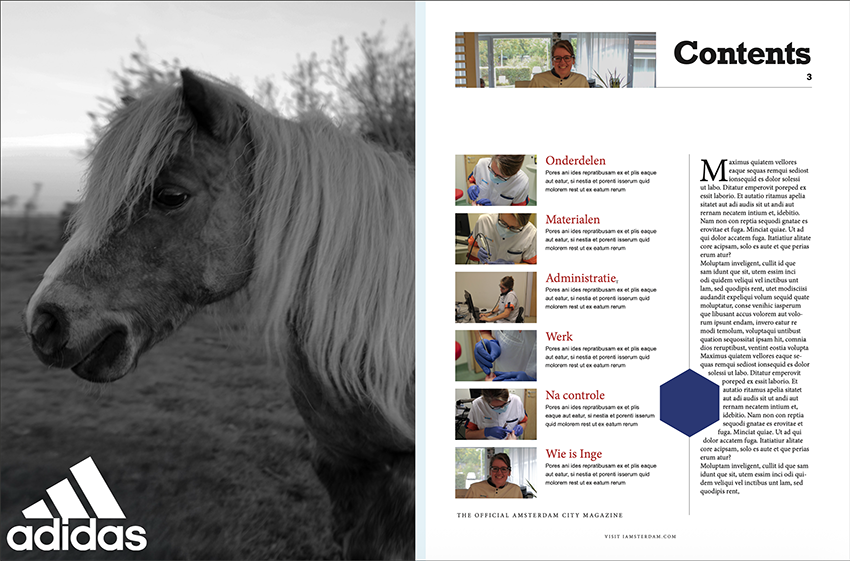 Voor dit project heb ik alle foto’s zelf geschoten en bewerkt, en deze vervolgens geplaatst binnen de opzet van de magazine. De teksten zijn niet herschreven en bevatten nog Lorem Ipsum-teksten.