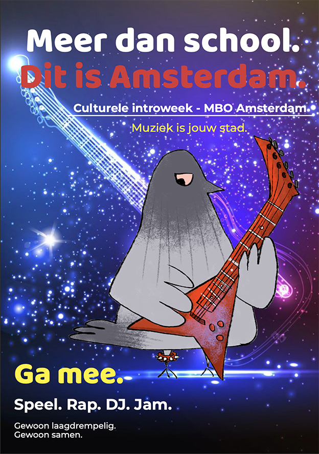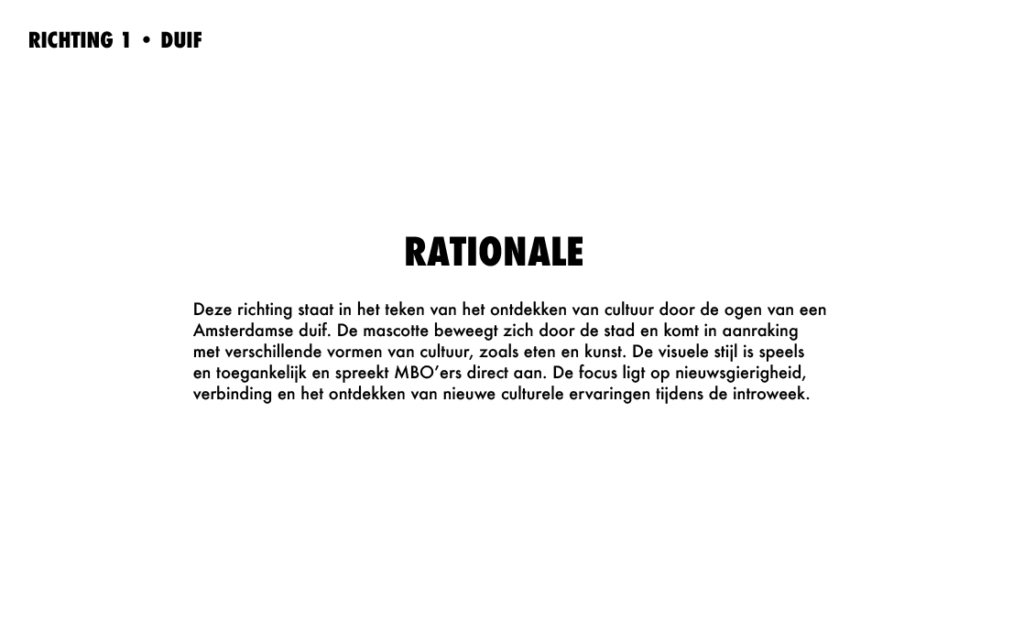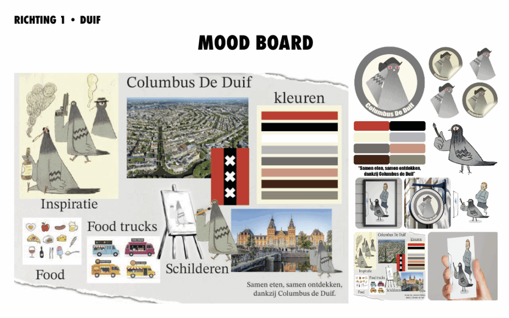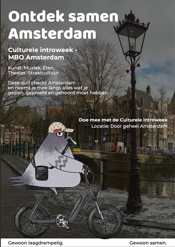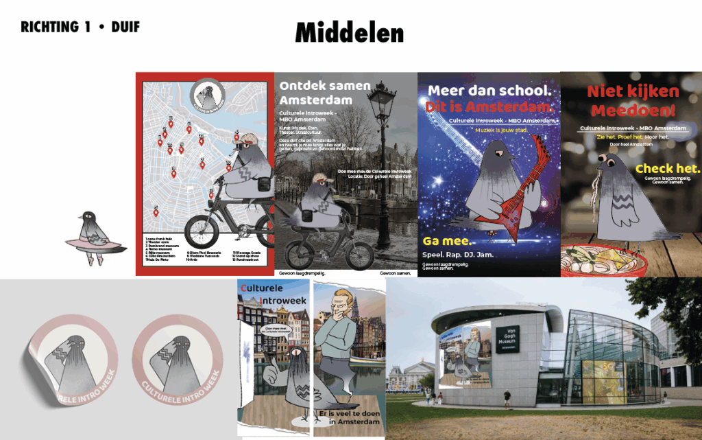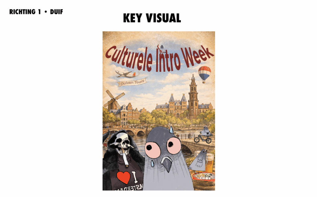 Voor de opdracht van een opdrachtgever hebben wij een concept ontwikkeld voor de Culturele Introweek, een evenement dat MBO-studenten in Amsterdam kennis laat maken met verschillende culturen. Tijdens een gezamenlijke brainstormsessie is ons concept ontstaan rondom een Amsterdamse duif die door de stad reist en verschillende culturen ontdekt.