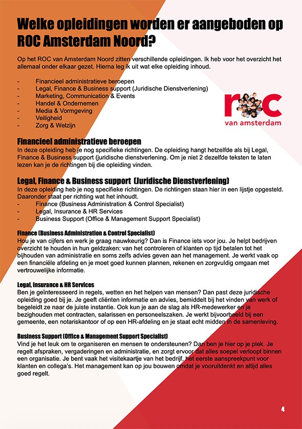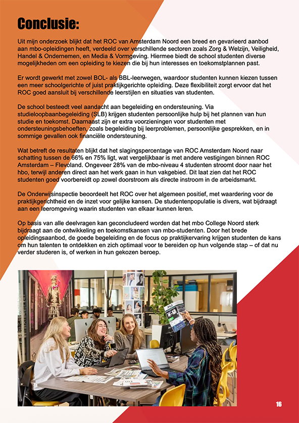 Voor mijn infographic heb ik een onderzoeksverslag opgesteld over het ROC van Amsterdam. Het doel was om relevante informatie inzichtelijk te maken voor studenten en geïnteresseerden. Hiervoor heb ik meerdere onderzoeksvragen geformuleerd, zoals: