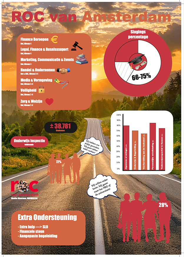 Bij de uitvoering van mijn infographic heb ik alle informatie uit mijn onderzoeksverslag zo volledig mogelijk verwerkt. Het ontwerp volgt volledig de huisstijl van het ROC van Amsterdam, wat zorgt voor een consistente en herkenbare uitstraling.