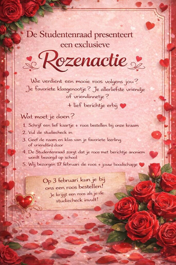 Voor de studentenraad heb ik een poster ontworpen voor de Rozenactie, een initiatief waarbij leerlingen gratis rozen kunnen laten bezorgen op school. De poster is uiteindelijk geplaatst op het Instagram-account van de studentenraad, waardoor hij direct zichtbaar werd voor de doelgroep.