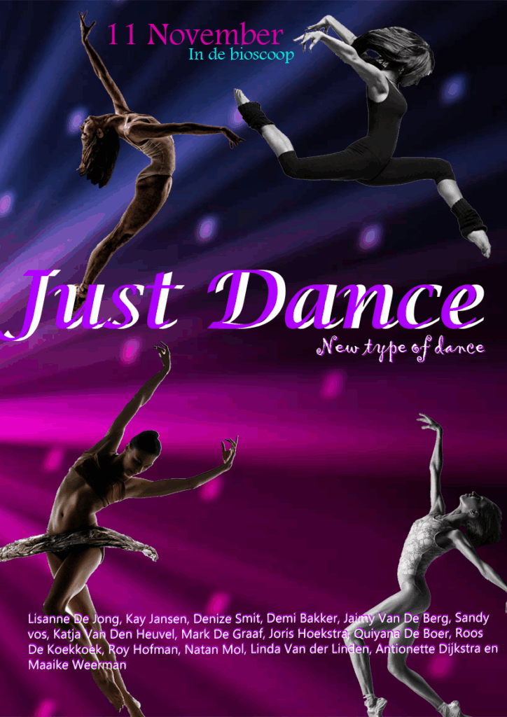 Voor deze opdracht ontwierp ik een filmposter voor een gefilmde dansshow genaamd Just Dance. Ik was volledig verantwoordelijk voor het creatieve proces, inclusief de posities, kleuren en het lettertype van de tekst, het kiezen van de cast en het bepalen van het tijdstip en de achtergrond van de poster.