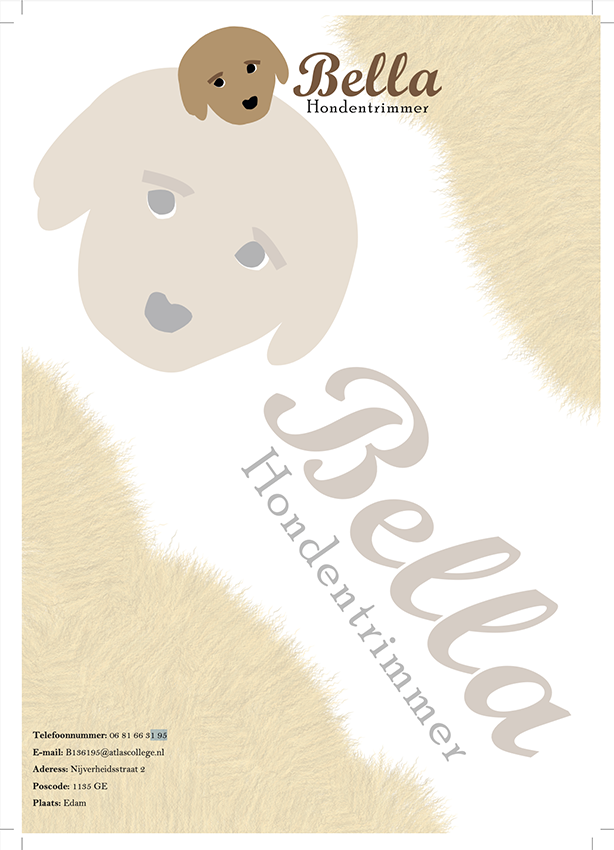 Voor mijn fictieve bedrijf Bella’s Hondentrimsalon heb ik briefpapier ontworpen dat duidelijk het logo en de huisstijl van het bedrijf laat zien. Het briefpapier is zo ontworpen dat het visueel aantrekkelijk is, maar tegelijk praktisch in gebruik, zodat er gemakkelijk op geschreven of geprint kan worden.